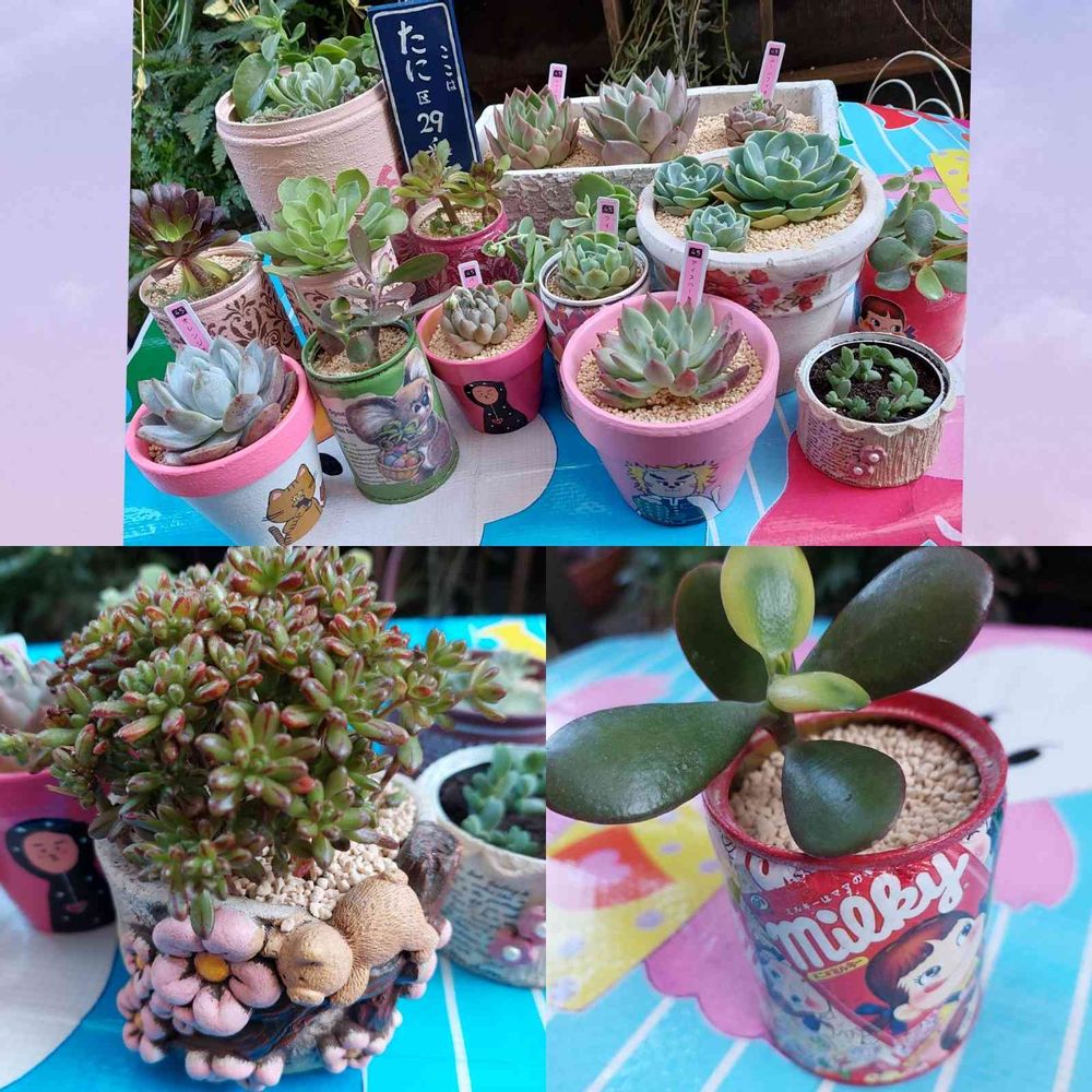 ⬆️かっきーちゃんからのピンクのリメ缶にはグランさんからのアエオさん達を植えました🎵シュンとしてた黒法師さん達も可愛いい鉢に植え替えたらイキイキしてきましたよ❤️大きなリメイ缶にもグランさんからのブロウメアナとトップシーとベビーサンローズを💕
