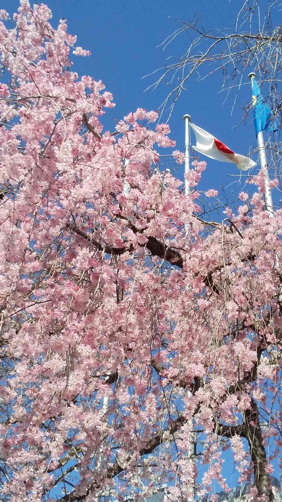 青空のもと「シダレザクラ」のピンク色のお花が満開です。🌸🌸💙😊😄🌞