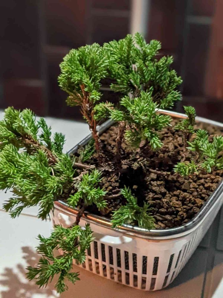 ソナレ😆曲がりが大きいので長方形のザルを利用して取り木をかけました🤔上手くいくかな〜?🥺