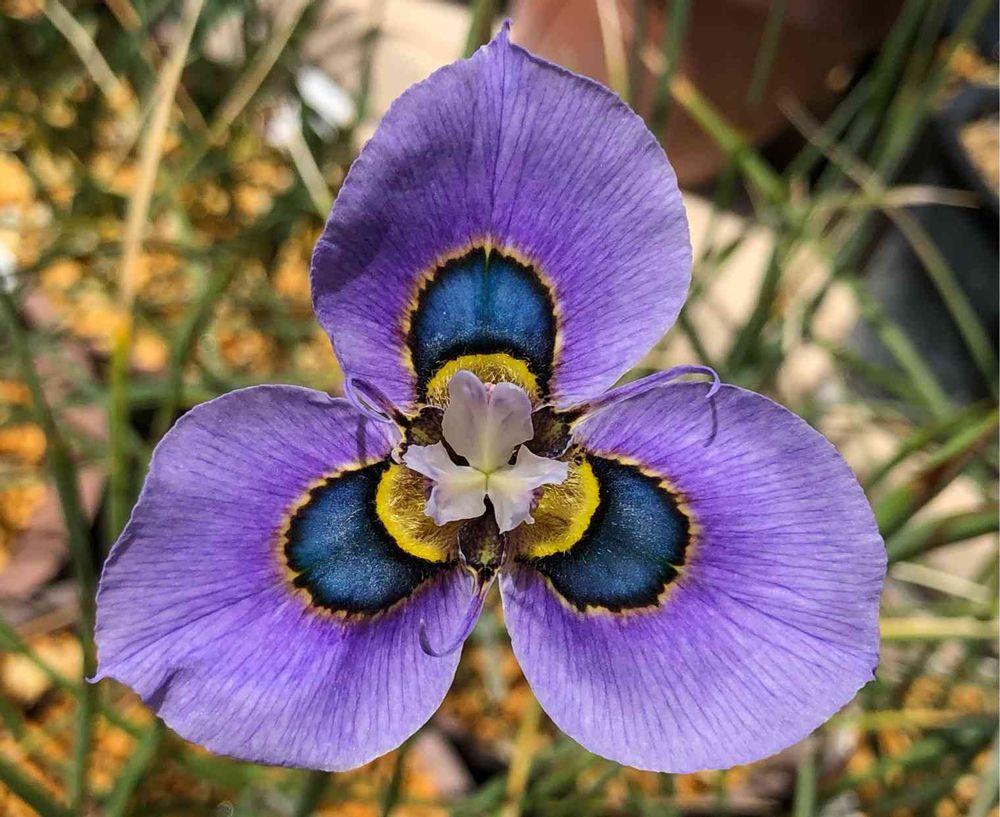 モレア(モラエア)ビローサが咲きました💜。模様がクジャクの羽根っぽいので、ピーコックモレアとも呼ばれるみたいです🦚