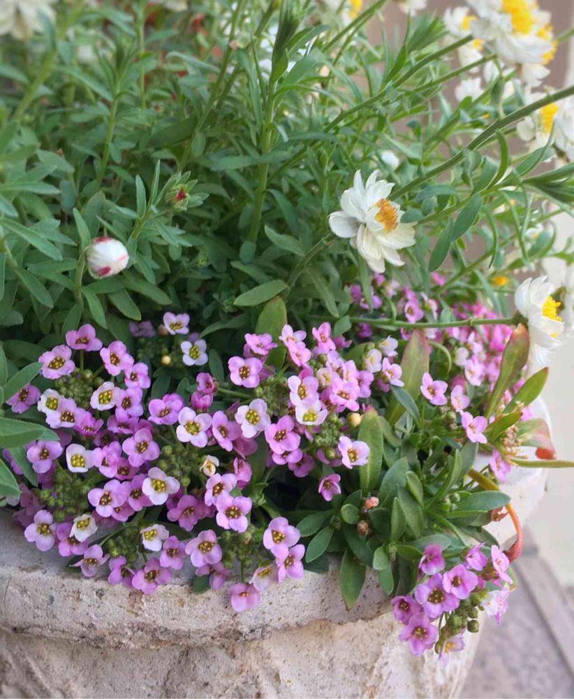 スイートアリッサム、可愛い色やねぇ😍うちには真っ白ちゃんと真紅みたいなコがいるけど、後者はほとんど花がつかんの😵 切り戻し難しい〰。