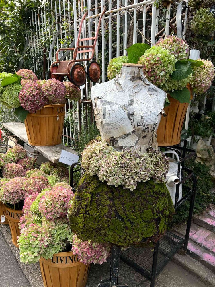 今回はアジサイをまとったトルソーがフラワーショップ入口でお迎えしてくれました。