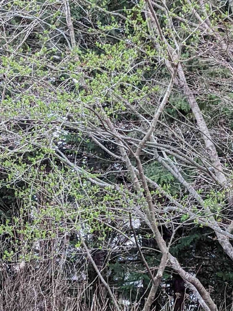 先日から庭の奥のイロハモミジの手前に 新葉がきれいな黄緑色で出ている木があります