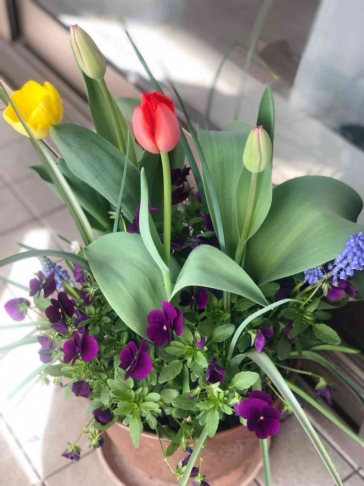 お正月に届けた秋植え球根❤️💛💜&ビオラ💜寄せ植え鉢のムスカリやチューリップ🌷も咲き出して小さな春です💖