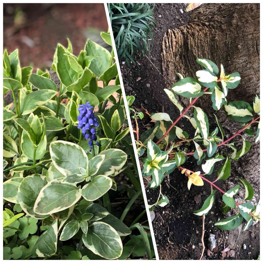 左は前からあるツルニチニチソウ、ちょっと立ち上がって元気になってきました。花はムスカリです。右は茎が赤くてコントラストキレイだなと最近買ったツルニチニチソウのワジョー・ジェムです。