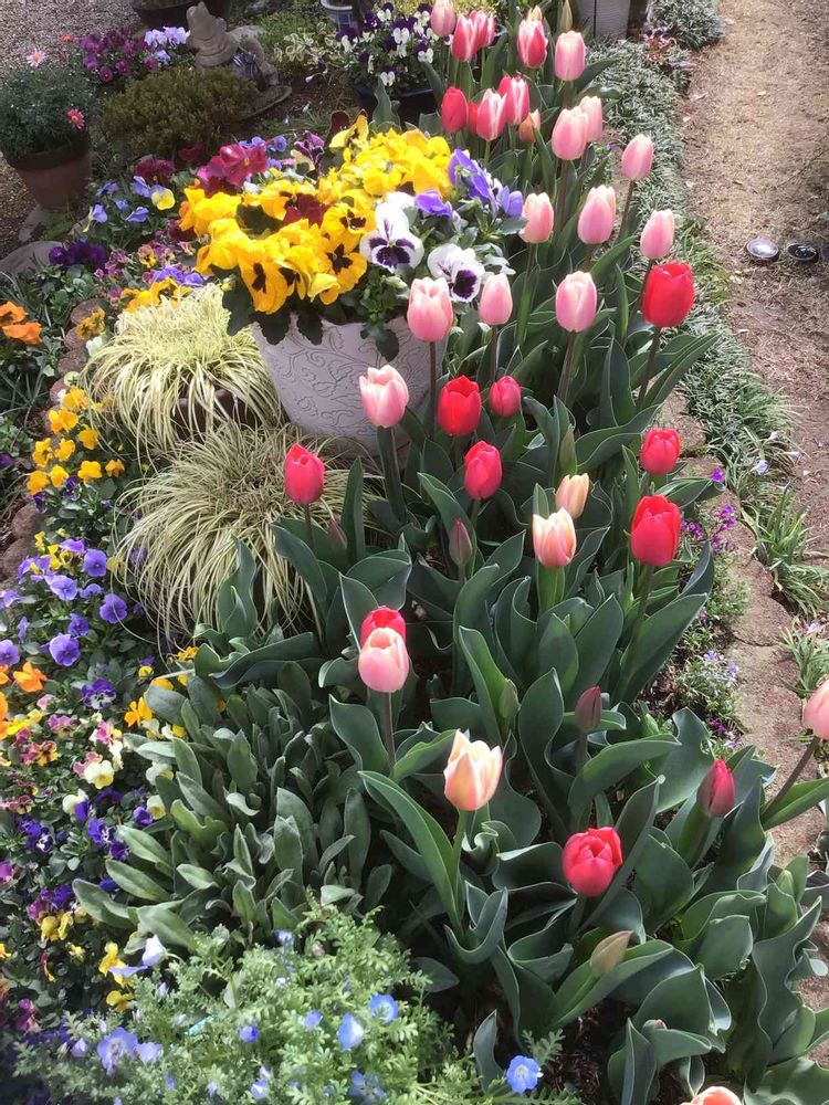 ビオラ、パンジー、チューリップ🌷などが 中心の 花壇で、春🌸