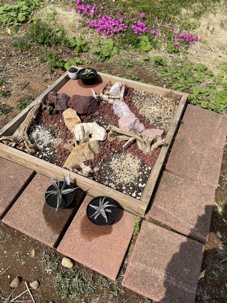 富士山の溶岩石を手前から奥が高くなるように雛壇に積み重ねて立体的に植えてみたい。地面よりも高くなれば排水も良さそう。