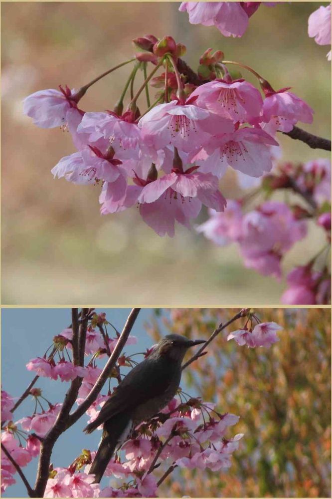 五岳の里公園、早咲きで濃い目のピンクが美しい陽光桜が綺麗に咲き、ヒヨドリさんも嬉しそうに蜜を吸っていました。