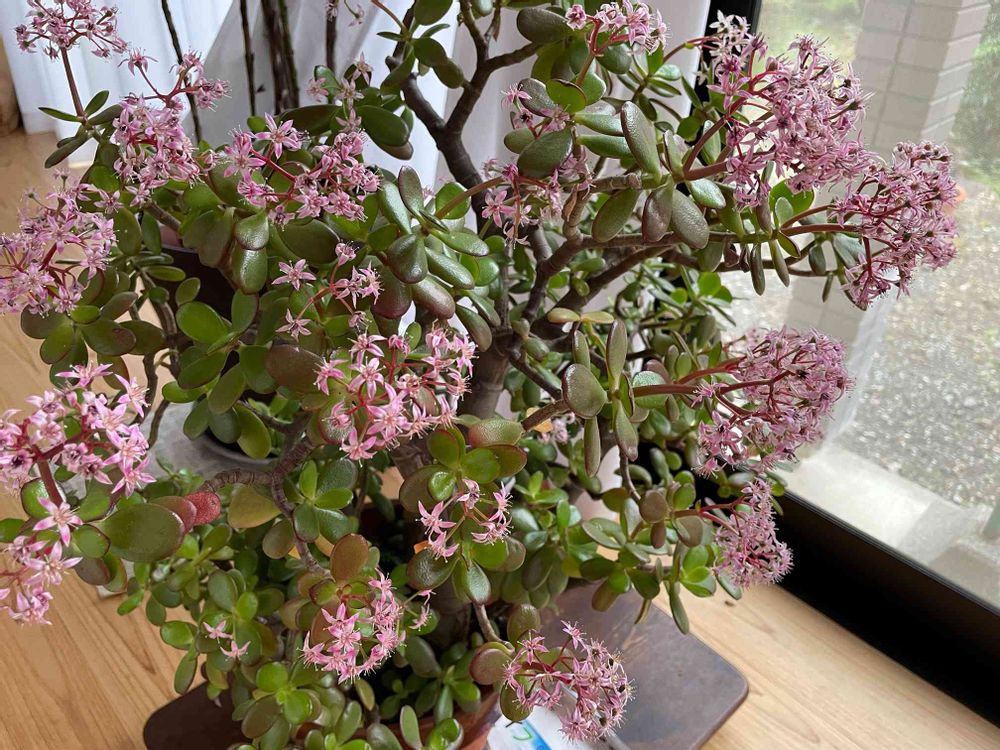 うちの金のなる木、何年経っても花が咲かないのに、凄いですね!しかもピンクで可愛い💕