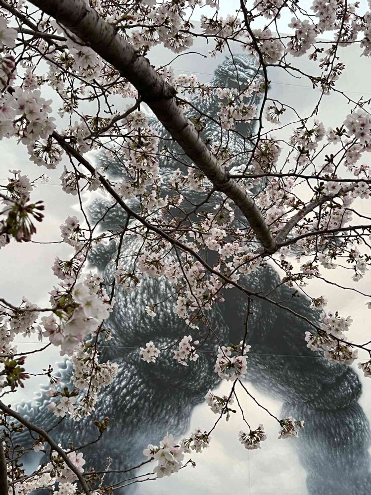 ほんのり色のある桜🌸の向こうのモノクロゴジラのふとももが、なんだか艶めかしい(*´д`*)♡