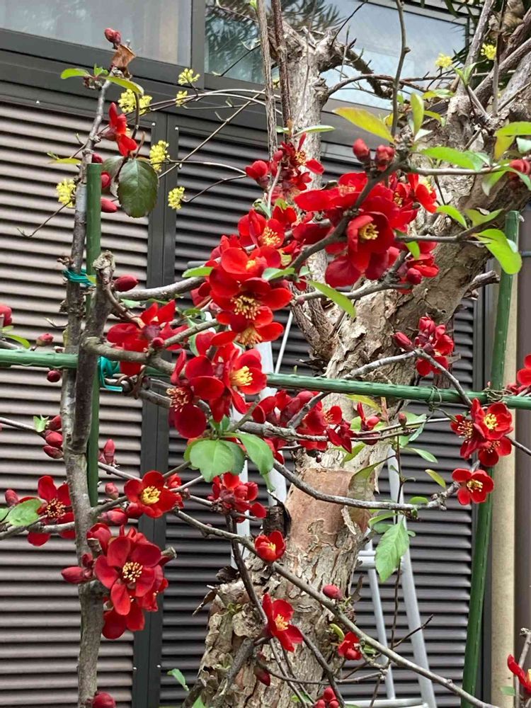 さん、木瓜の花はこの真紅のものが印象深いですが、他にも淡い色のもの、バイカラーのものなどもありますね。好きな花の一つです。