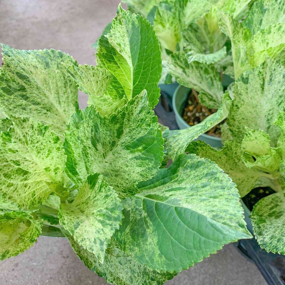 昨年の新品種で、アジサイの葉に明るい色の斑が😮‼️
