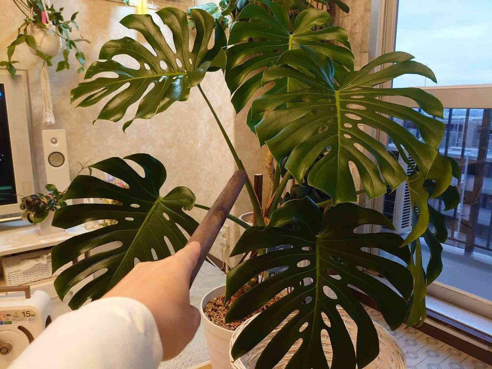 おはようございます。実はモンステラことテイオーの支柱を分割脱着式に仕様変更しました。また暴れ出して来たので早速効果発揮です✨