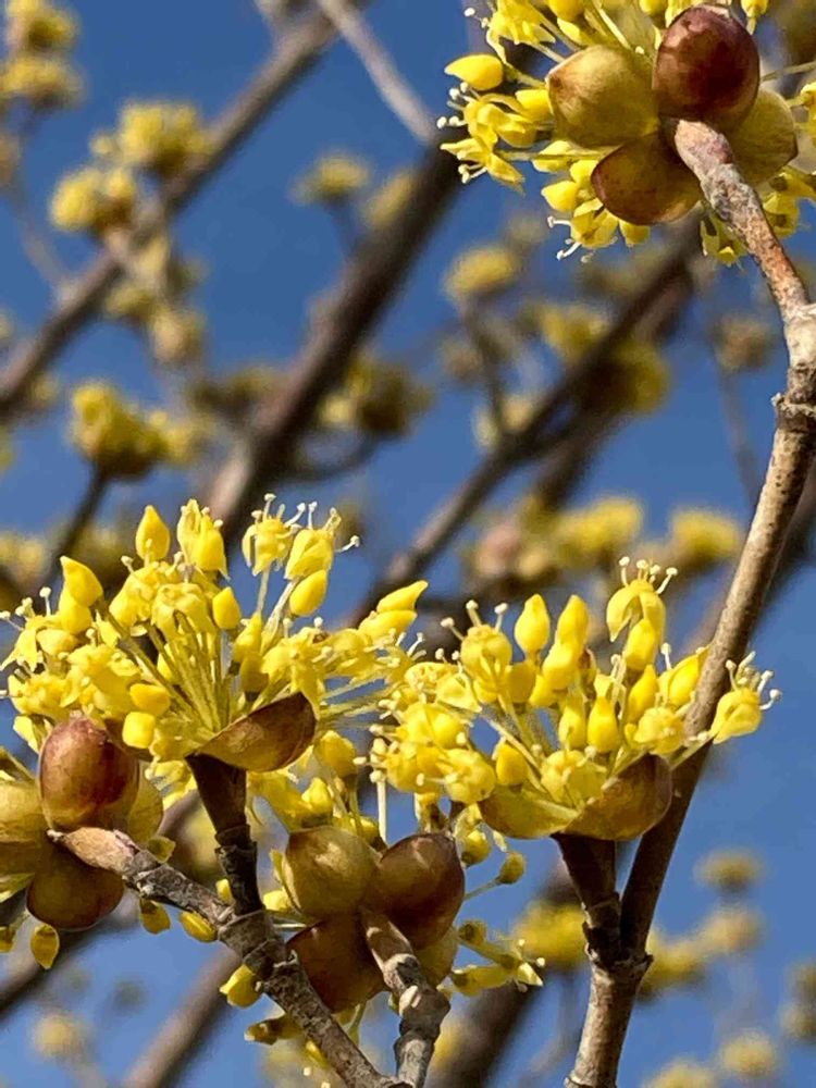 青空とビタミンカラー💛のサンシュユが朝に爽やかさを~🎶