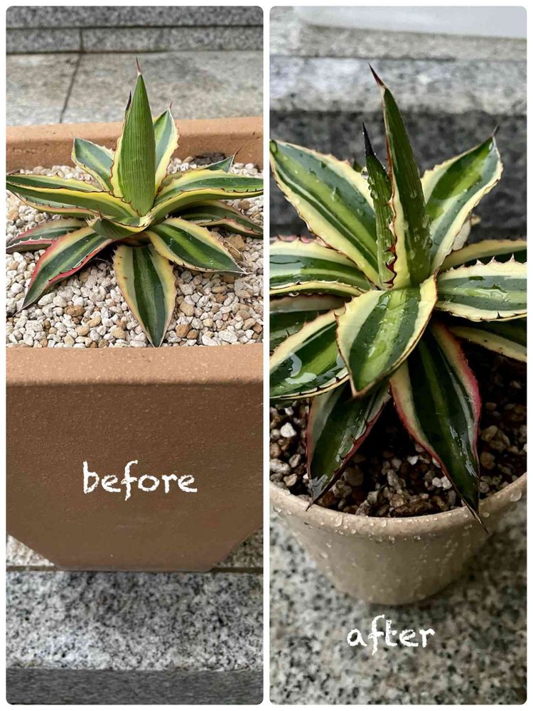 こちらは、大きくなるのを期待して、大きい鉢に入れたのに全然大きくならない五色万代。。。とにかく鉢が重いので、手持ちから鉢を選んでジャストサイズに植えました。