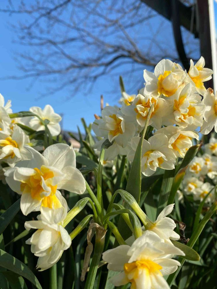 水仙が朝日でキラキラしていて綺麗だったので、立ち止まってパシャリ( ˊᵕˋ* )✧︎*。