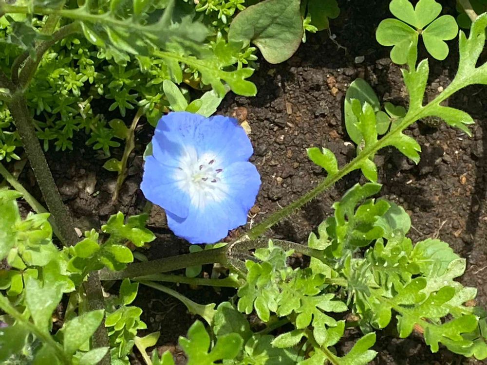 💙🤍ネモフィラ🤍💙が一輪咲きました。 去年初めて苗を植えて、零れ種から咲きました。 一株だけかと思ったら、幾つも溢れていました。💙💙💙