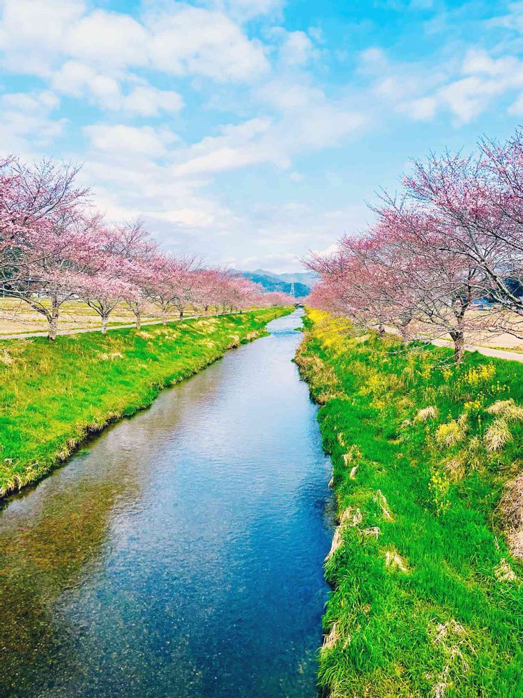 田園風景の中の桜並木で川岸には菜の花が咲き