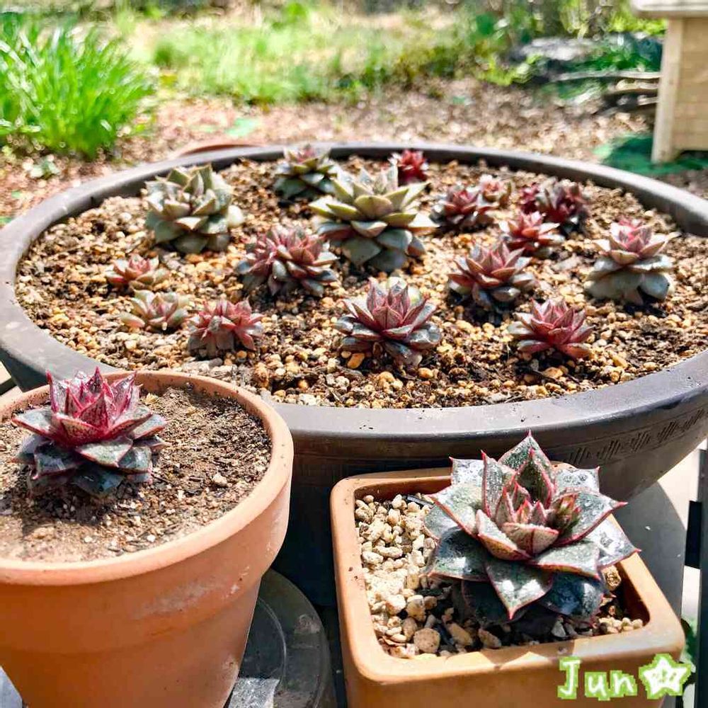 大和錦大増殖w 先日植え替えました!直径2cm程だったたった1つの株からみんな誕生しました!親株はボスキャラ的なデカさなのでここにいません(^^)