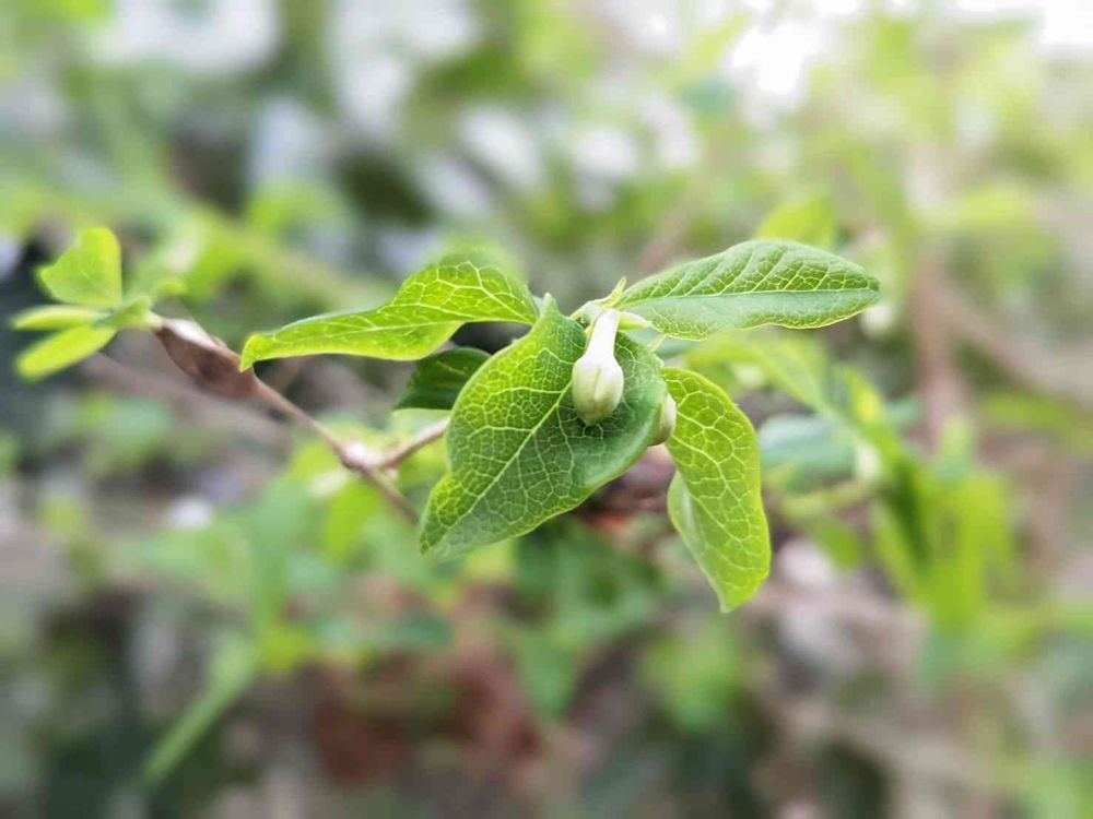 アプローチの白花ウグイスカグラに小さい蕾が出来ています