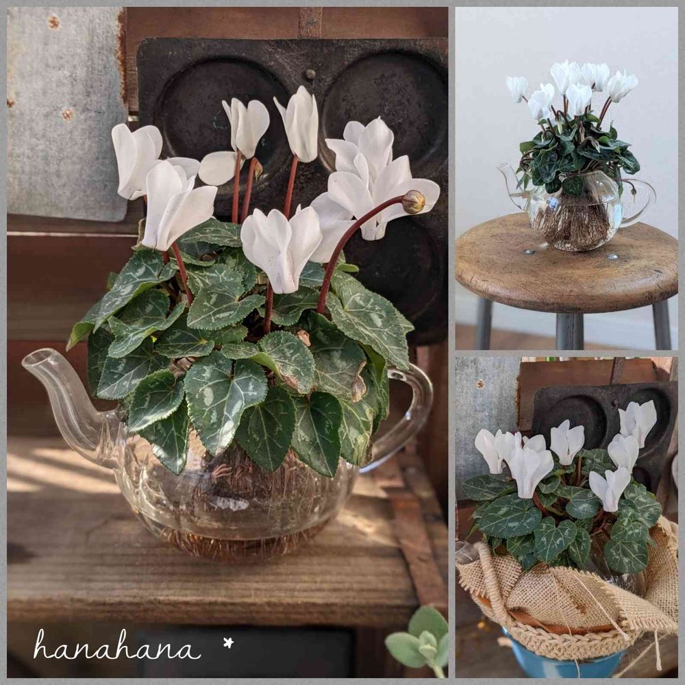 ガーデンシクラメンの水耕栽培。初挑戦でしたが、無事冬越し出来ました! 麻布巻き巻きして、過保護にしたからかな??😆今度は夏越し頑張ってみますね💪 蓋が割れてしまったガラスポットも捨てなくて良かったです😁