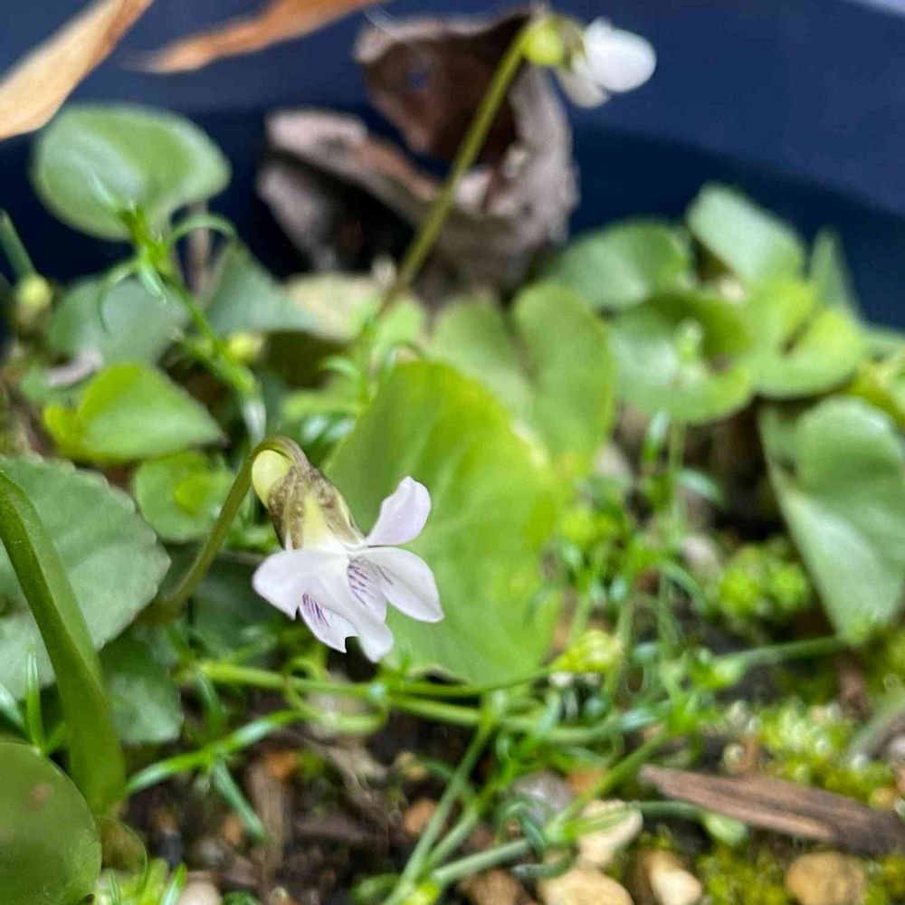 シロバナタチツボスミレ(多分)。他の植物を植えている鉢から自然に生えてきました。葉っぱはハート型で花が白、距まで白いので、シロバナタチツボスミレかな、と(違ったらご指摘ください🙇♀️)。とても可憐です。