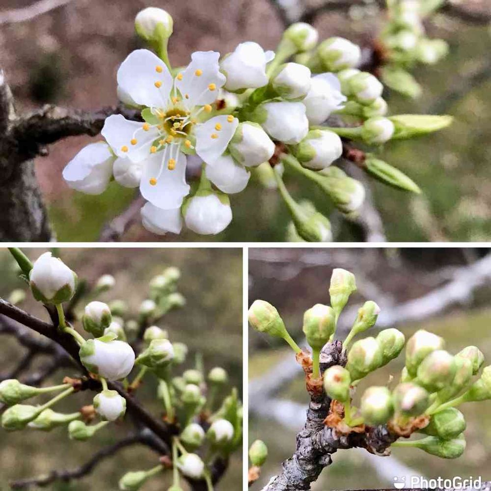 我が家のスモモ、暖冬だった去年に比べ1週間程遅れ、ほぼ平年並みに、中生品種・ソルダムから開花し始めた😃。