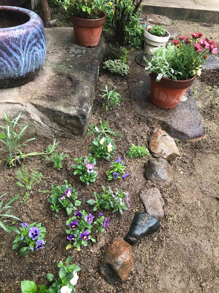 後方には、私が種ミックスで育てた 何が育つの?何が育つの? 的な、不明な苗も植えてみました。まだ花の蕾も確認できず、若干不安です…(ちゃんと種の袋をとっておくべきですね😇)