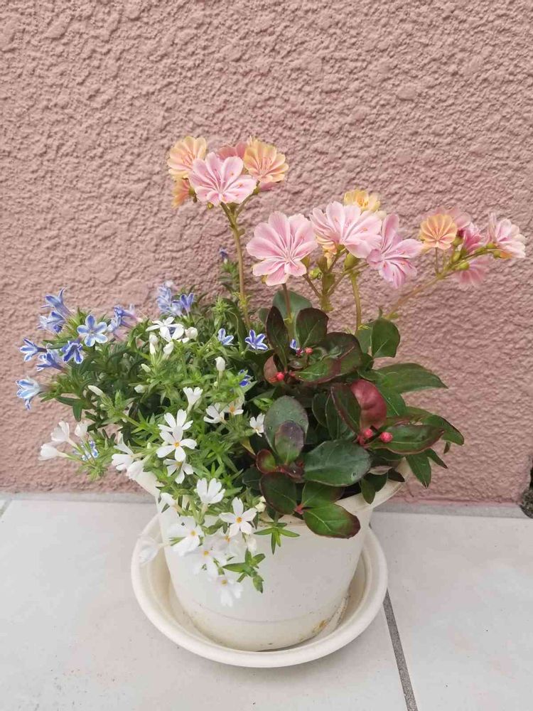 リンドラ(スター)とシバザクラ、他の鉢で葉牡丹と寄せ植していたチェッカーベリーもお引っ越しさせて合わせてみました☺️