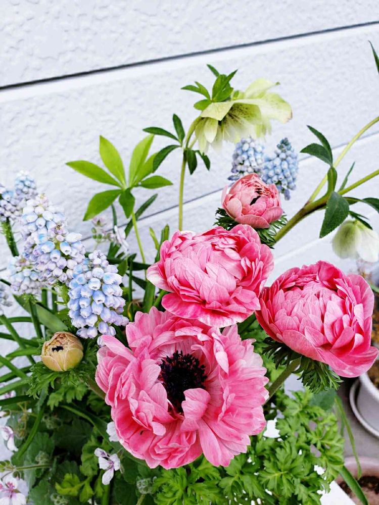 アネモネがふっくらぽってりと揺れる朝7時の寄せ植え。