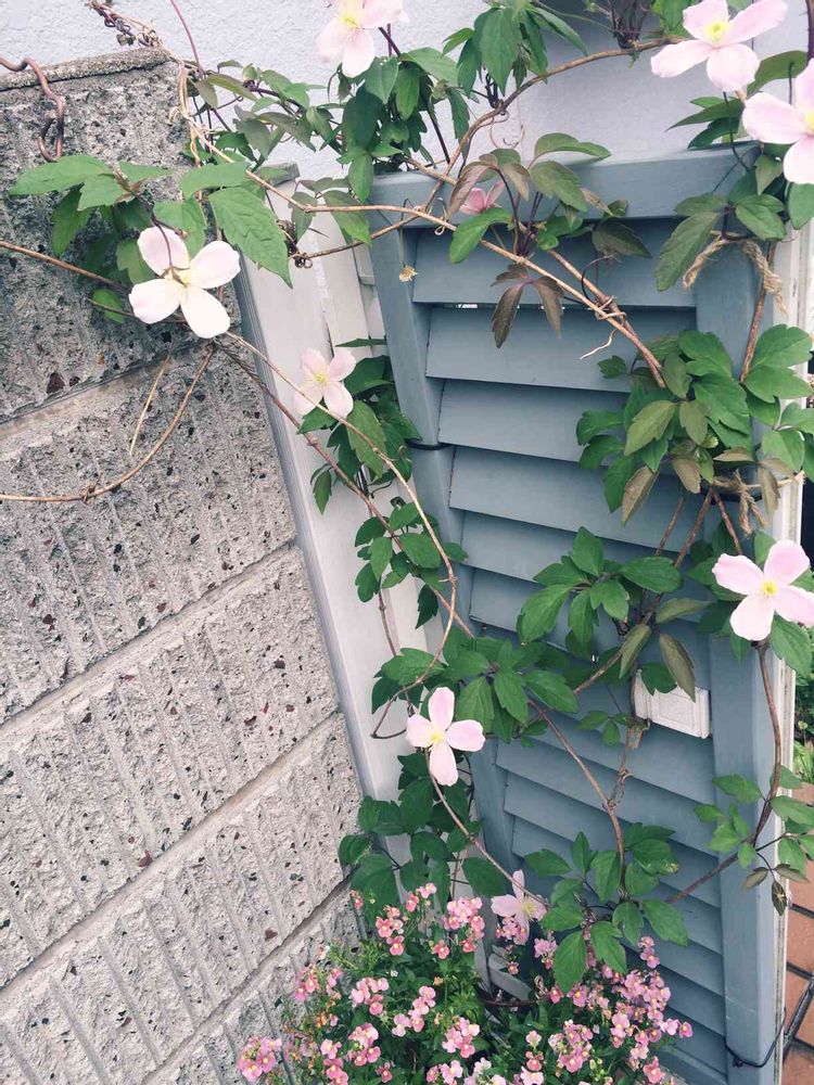 市販のルーバーフェンスをペイントして、クレマチスモンタナを絡めてみました。味気ない賃貸アパートの門をデコレーション。