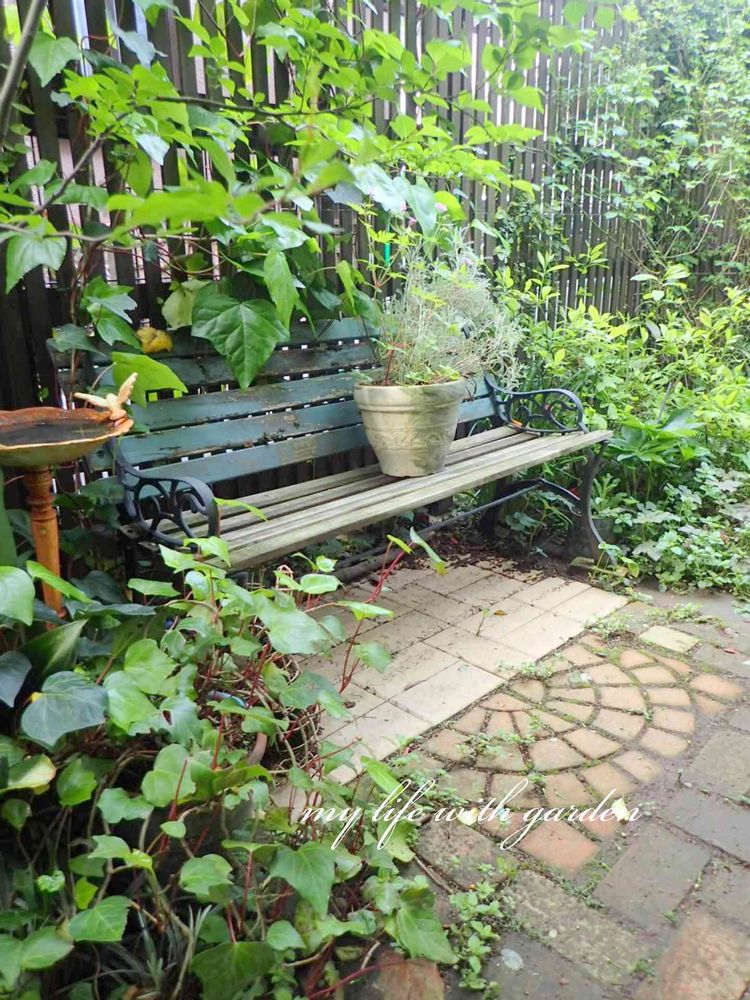 さん ありがとうございます♪ この大きな葉はオカメづタです。左手前の鉢から伸びた枝がベンチにまで絡んでいます。大きくなりすぎないように鉢植えにしています。