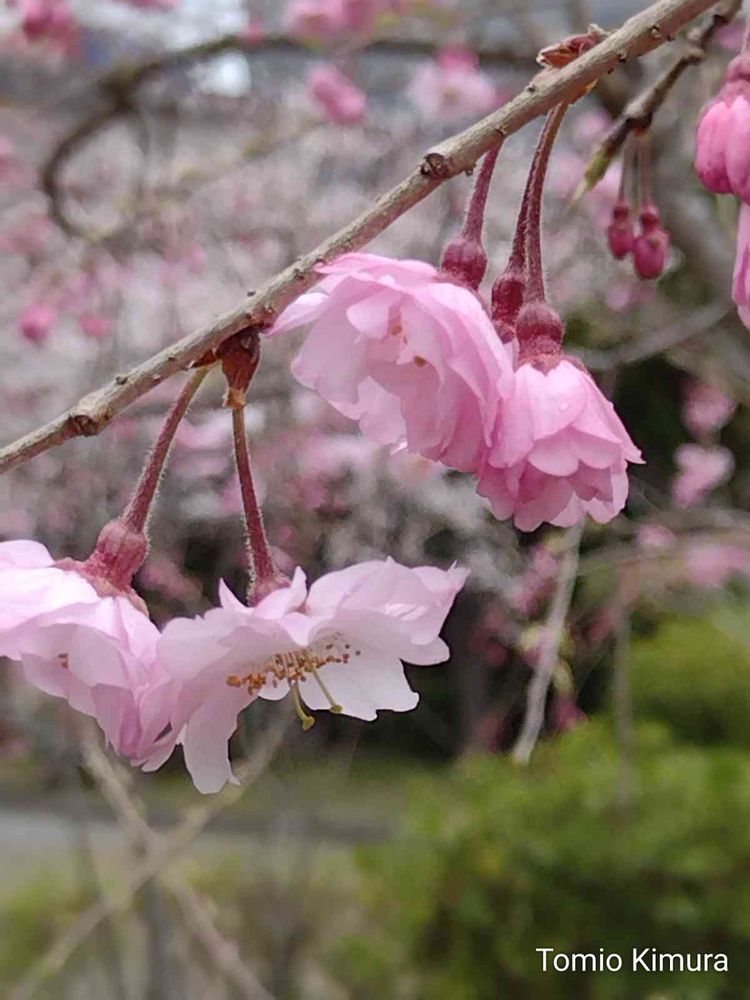花冷えの散歩道で、八重の紅枝垂桜が、、、