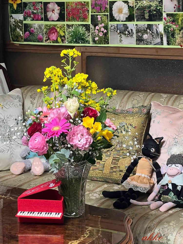 部屋,菜の花,最近いただいたグッズと花束の投稿画像