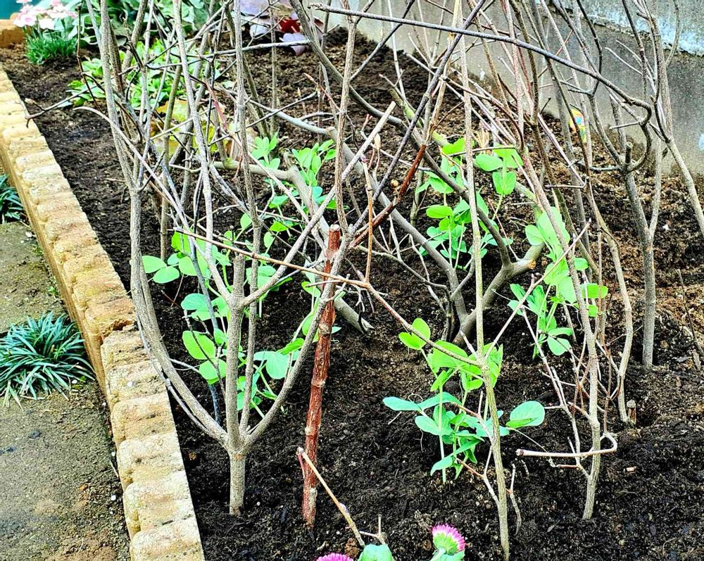 お豆の芽が伸びてきたので、庭木の剪定枝で囲ってあげました。好きなやり方♪