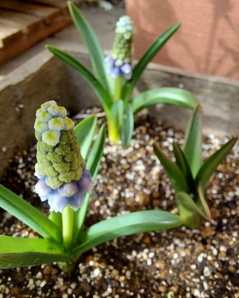 孫👧とお揃いで育てている秋植え球根プランターのミニミニチューリップ🌷とムスカリの蕾も色づいてきて💙💜可愛いです😍💓🎶