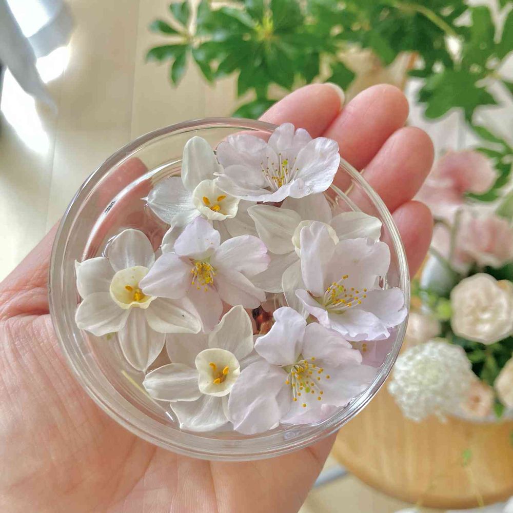 強風で折れてしまった桜の花びらを水に浮かべました。