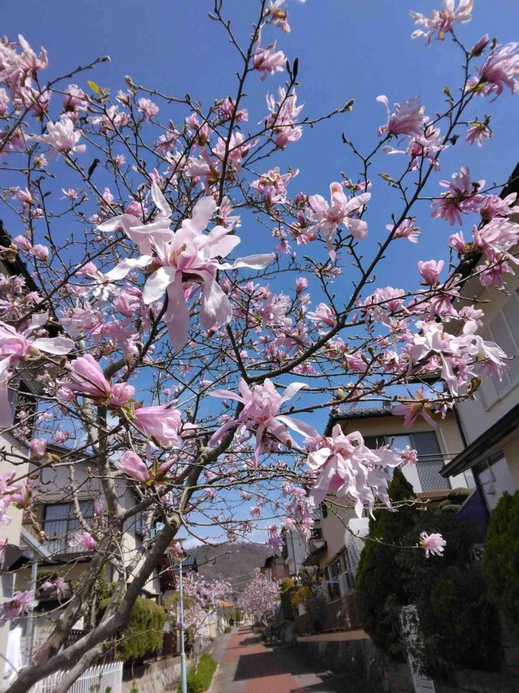 我が家の横は遊歩道に成っていて、川西市がピンクのシデコブシを植栽。