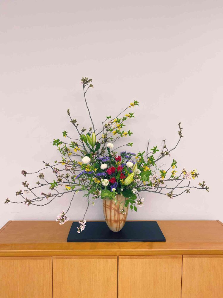 今回は、桜やレンギョウの枝をのびのびと伸ばして、大きくいけてました。