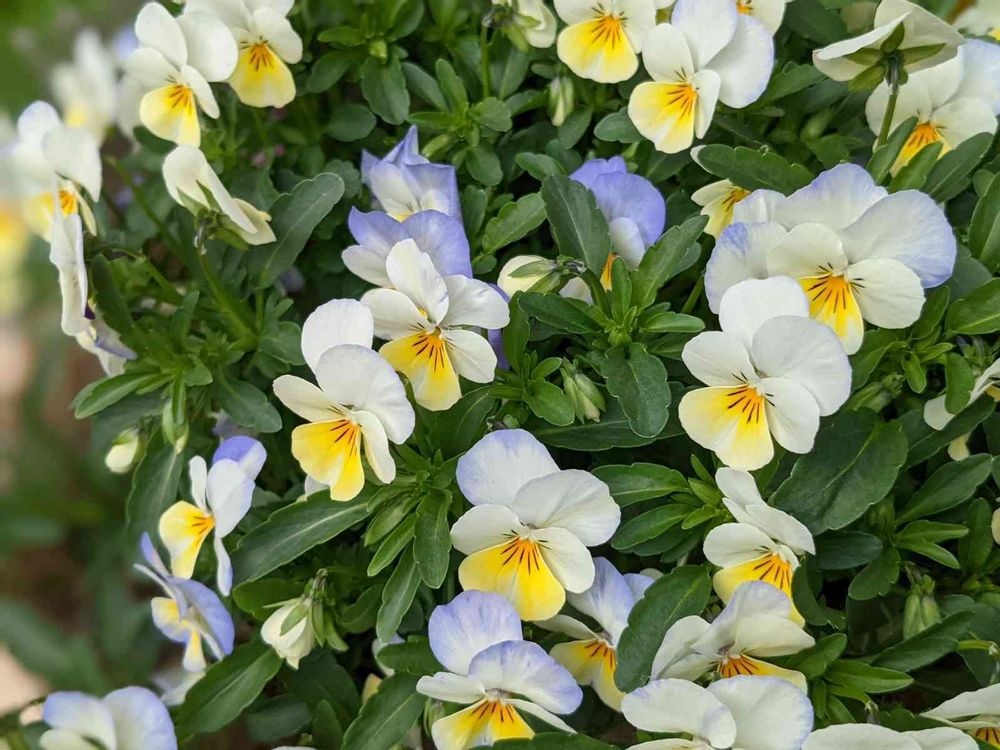 このビオラは寒いと、花びらの周りが青く色づくけど、あたたかいと、白いです。