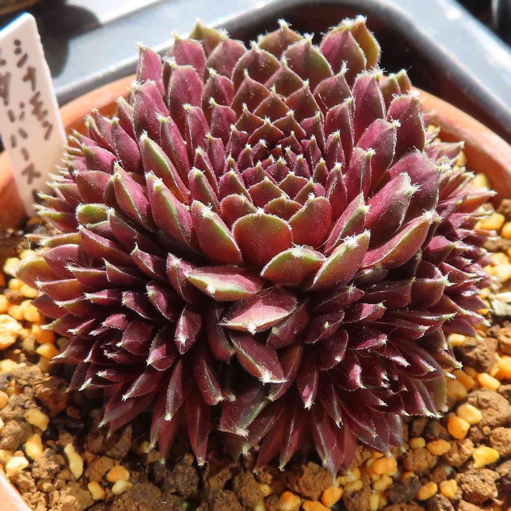 ぐるっと周りに出ている子株が同じように成長して,側面はどこから見ても同じ姿。日の光の下では葉先の毛のような部分が一瞬輝いているように見える。