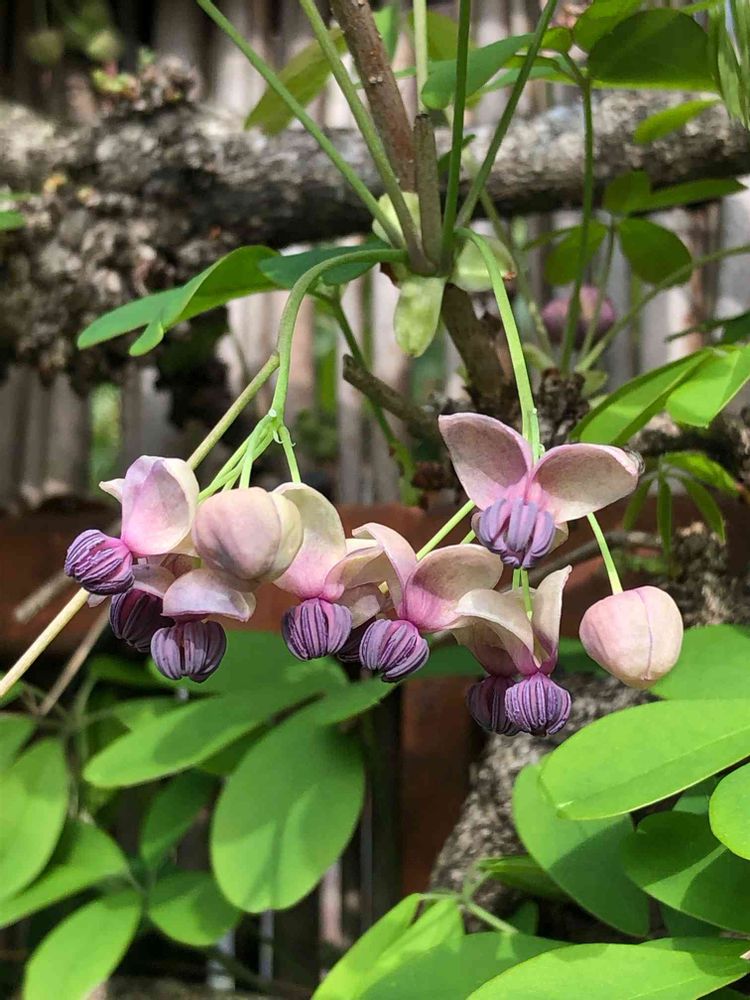 アケビの花は、縮緬で造られたような素敵な花ですね。😉🎵