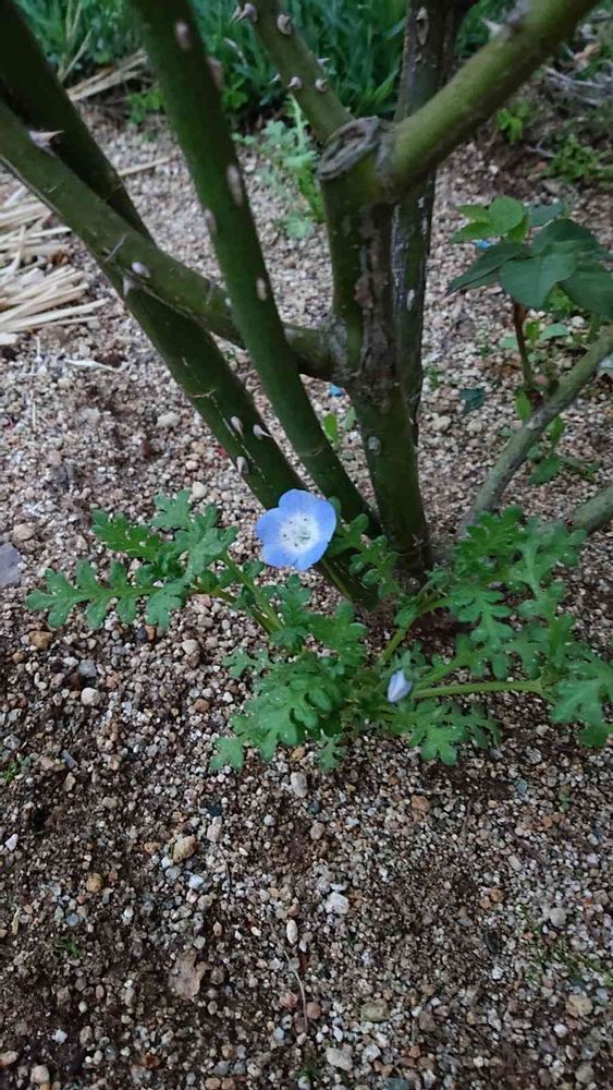 🌺バラの株本で零れ種のネモヒラの花が咲き始めました。
