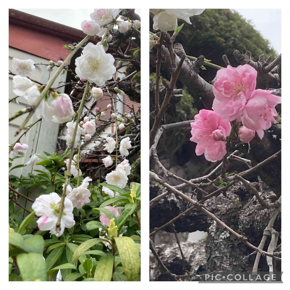 お隣の塀の上から見えているのは何でしょう?桜…桃…梅…違いがよく分からず、、白とピンク一本の木から出ているように見えます。
