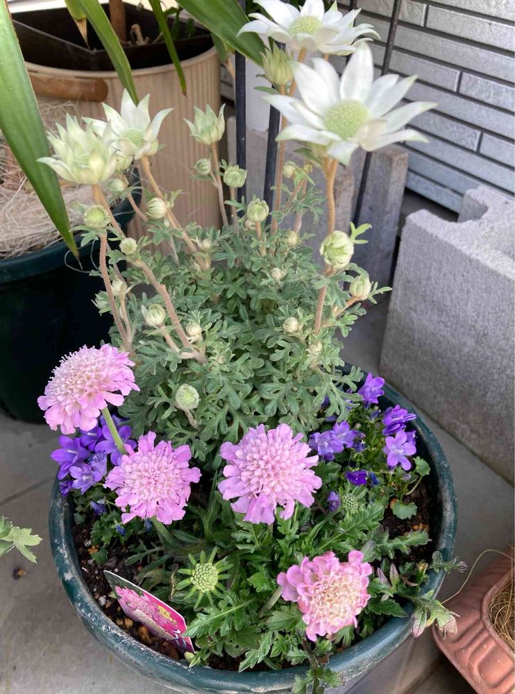 フランネルフラワーのすくっとした佇まいと、広がるスカビオサとベルフラワーの💜💖が素敵な寄せ植えですね〜‼️