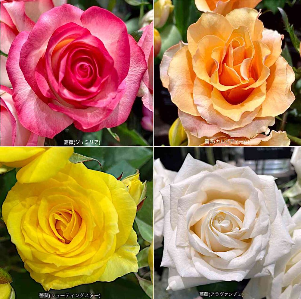 複色(混色)x1、薄褐色系x1、黄系x1、白系x1のバラ、4つ。