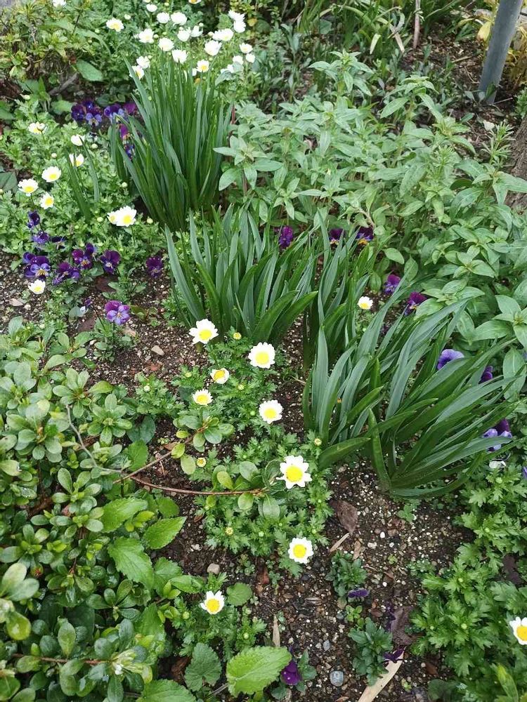 カマッシアはグンと背伸びして、こぼれ種からのノースポールやビオラも花が咲き始め、