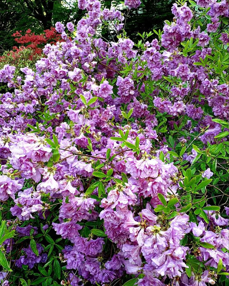 紅紫色のヨドガワツツジ。雨上がりの早朝、びしょ濡れになりながら満開に咲いていました。小鳥だったら、フルフルッって出来るのでしょうけれど…。