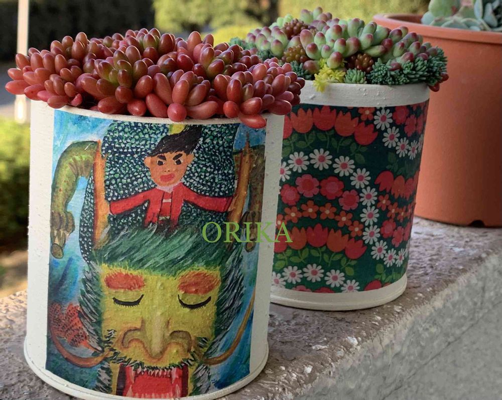 うちのボーヤが可愛い可愛いちびっ子だった頃に描いた絵を、リメ缶にしてみました😊気根ボーボーだった虹の玉を植えかえましたよ❣️