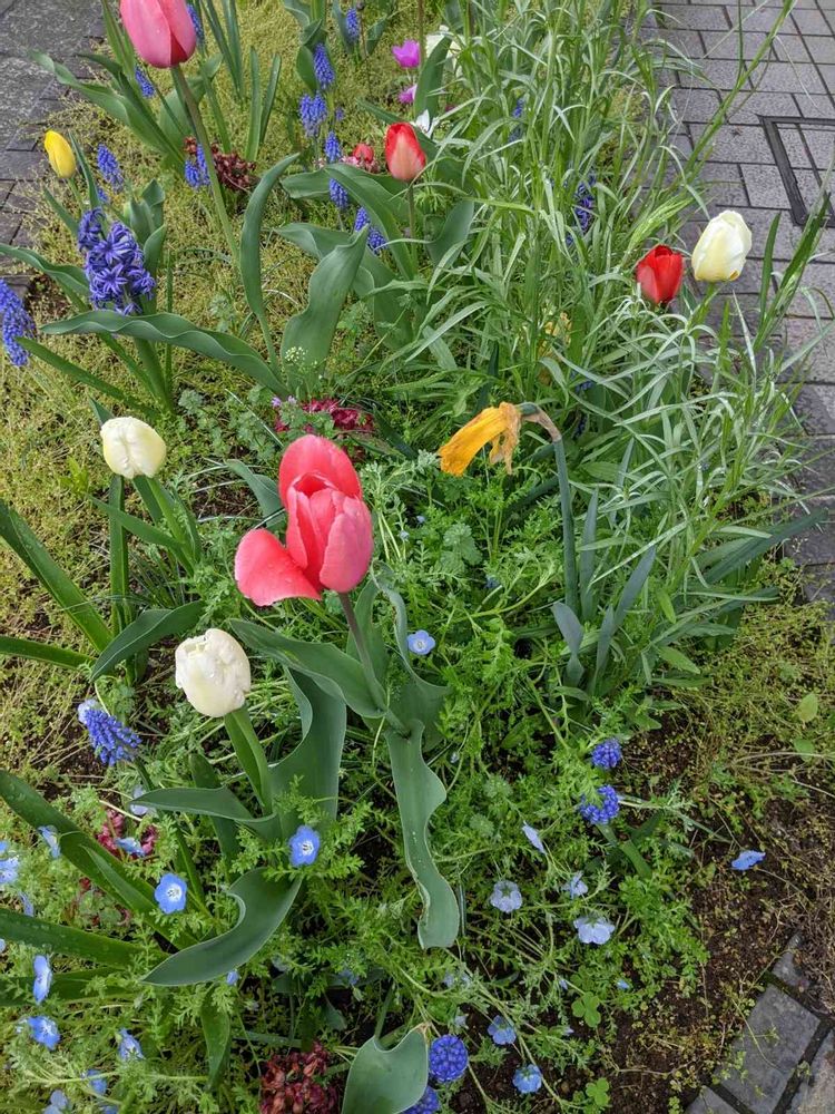 昨日の昼休み、散歩の途中で見かけたチューリップたち。一つの花壇に数種類の花を植えてあり、乱れ咲きであった。青い花写ってるかな!